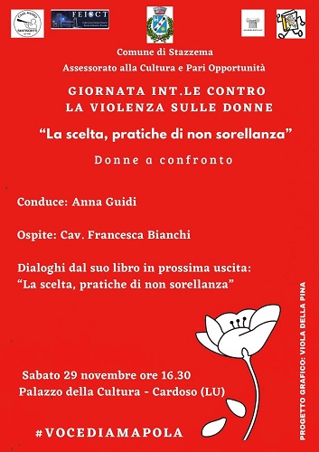 L'iniziativa è organizzata dall'assessore alla cultura e alle pari opportunità, Anna Guidi, che aprirà l'incontro introducendo le tematiche della serata. «Celebrare le giornate dedicate – commenta l'assessore alla cultura e alle pari opportunità Anna Guidi – è importante perché si attira ulteriormente l'attenzione. E sottolineo ulteriormente perché ogni giorno o quasi, purtroppo, siamo chiamati a registrare nomi e situazioni di una mattanza che continua. Sabato prossimo a Cardoso ne discuteremo con Francesca Bianchi, Cavaliere della Repubblica, impegnata da tempo e su più fronti a diffondere cultura. Il tema pone l'accento sulla scelta e sulla non sorellanza, argomenti che richiedono sguardo sincero e volontà di raccontarsi». Durante l'incontro, Francesca Bianchi porterà la sua duplice esperienza di scrittrice e attivista, autrice sia di libri per l'infanzia sia dell'ultimo volume dedicato alle donne, "La scelta. Pratiche di non sorellanza". Una riflessione che indaga non solo la violenza maschile sulle donne, ma anche quelle dinamiche meno raccontate in cui sono le stesse donne a esercitare forme di violenza o svalutazione verso altre donne: economica, psicologica, legata alla maternità, alla separazione, al giudizio sociale. Bianchi racconterà anche i progetti nati dal suo incontro quotidiano con donne che vivono contesti difficili e collaborano con associazioni che si occupano di violenza di genere. La sua attività creativa si intreccia con quella educativa: con sua figlia Viola ha dato vita a campagne artistiche e di sensibilizzazione come "Una viola tra le rose", da cui sono nati manifesti, cartoline, segnalibri e materiali grafici; "Io non resto al buio", dedicata alla violenza di genere e al bullismo, rappresentata da due margherite disegnate dalla bambina; e "Voce di Amapola", simbolo del papavero, fiore fragile ma capace di lasciare un segno indelebile quando i suoi petali cadono: un'immagine potente della donna che, anche quando viene colpita, continua a imprimere tracce della propria esistenza e della propria forza. Nel corso dell'iniziativa verranno distribuiti segnalibri antiviolenza, che – come spiega la scrittrice – «saranno un invito a diventare portavoce attivi di un messaggio: ogni donna o uomo che ne riceverà uno potrà farsi tramite di una consapevolezza più ampia». «Vengo a Cardoso in duplice veste – afferma Francesca Bianchi – come scrittrice e come donna che ogni giorno incontra altre donne e ascolta le loro storie. Nel mio ultimo libro, "La scelta. Pratiche di non sorellanza", ho scelto di non puntare il dito solo sugli uomini, ma di raccontare anche ciò che le donne possono fare ad altre donne: le pressioni sociali, la violenza economica, i giudizi sulla maternità, le aspettative sulla sofferenza. La società spesso ci vuole sofferenti, e se non mostriamo dolore si pensa che non stiamo vivendo difficoltà reali. Io voglio scardinare questi stereotipi. Nel dialogo di sabato scopriremo insieme dinamiche che, in modo esplicito o sottile, molte di noi hanno vissuto o subito. Credo profondamente che senza una reale sensibilità tra donne, senza un'alleanza autentica, non sarà mai possibile disinnescare il patriarcato. Farlo è una scelta, e parlarne è il primo passo».
