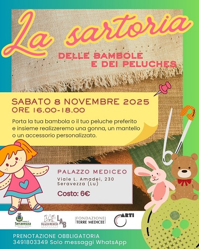 Iniziativa particolare per gli appassionati di bambole o peluches o che, magari, intendono fare un regalo particolare in vista delle festività natalizie. Sabato 8 novembre alle ore 16 si terrà, a Palazzo Mediceo, l'iniziativa "La sartoria delle bambole e dei peluches". Portando una bambola o un peluche, sarà ideato e realizzato un abito personalizzato, come una gonna, un mantello o un altro accessorio.