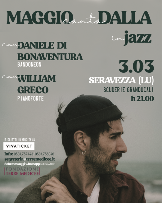 "Maggio canta Dalla in jazz" è il titolo della serata per ricordare e festeggiare Lucio Dalla, alla vigilia di quello che sarebbe il suo 83° compleanno. È quanto propone la Fondazione Terre Medicee per martedì 3 marzo alle ore 21 (apertura del teatro alle ore 20) alle Scuderie Granducali. A rendere questo tributo all'indimenticabile artista bolognese sarà il cantautore Antonio Maggio che farà tappa a Seravezza con lo speciale "Aspettando il 4 marzo", accompagnato sul palco da Daniele Di Bonaventura al bandoneon e da William Greco al pianoforte. Antonio Maggio, vincitore tra le altre cose del Festival di Sanremo 2013 e ospite d'onore in quello del 2020, reinterpreta intimamente e in chiave jazz l'opera di Dalla, scegliendo di essere accompagnato sul palco da due musicisti di grande spessore nel panorama jazzistico, italiano e non solo. Per la sua particolare e innovativa riproposizione dell'opera dalliana, inoltre, Antonio Maggio é stato anche ospite della Fondazione Dalla a Bologna in quella che fu la storica casa dell'artista, per omaggiarlo assieme ad altri cantautori di spicco della scena italiana, tra i quali Brunori Sas, Ermal Meta e Dente.