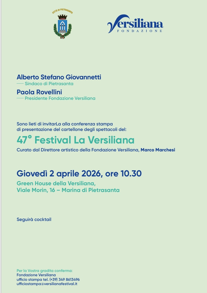 Giovedì 2 aprile, alle ore 10,30, presso la Green House della Versiliana a Marina di Pietrasanta, si terrà la conferenza stampa di presentazione del cartellone degli spettacoli del 47° Festival La Versiliana.