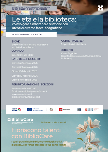 Quali strategie si possono mettere in atto per far sì che persone di età diverse si sentano 'a casa' nelle biblioteche? Una domanda alla quale può dare una risposta il corso specialistico organizzato dalla Provincia di Lucca nell'ambito del progetto Bibliocare, «Le età e la biblioteca: coinvolgere e mantenere relazioni con utenti di diverse fasce anagrafiche» che partirà nel prossimo mese di gennaio, ma per il quale sono già aperte le iscrizioni.