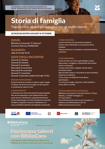 C'è tempo fino al 16 ottobre per iscriversi al corso gratuito nato nell'ambito del progetto Bibliocare, «Storia di famiglia - Traccia il tuo albero genealogico con gli archivi storici» in programma a Viareggio - Archivio storico della Biblioteca 'Marconi' - dal 23 ottobre. In sette incontri, - 23, 30 ottobre; 6, 12, 19, 27 novembre e 4 dicembre -, si apprenderà a scoprire da dove veniamo, cosa che aiuta a capire meglio anche chi siamo. Gli archivi sono luoghi vivi, di scoperta e condivisione. Peculiarità di questo corso è che è stato pensato per chi si avvicina per la prima volta a un archivio e non è necessaria alcuna competenza o esperienza.