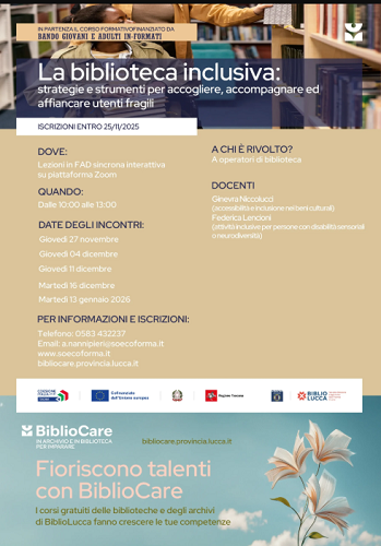 Parte il 27 novembre il corso gratuito «La biblioteca inclusiva - Strategie e strumenti per accogliere, accompagnare e affiancare utenti fragili», realizzato nell'ambito del progetto della Provincia di Lucca, Bibliocare e rivolto a bibliotecari e bibliotecarie, ma anche a tutto il mondo associazionistico e degli insegnanti e non che ruota attorno a queste strutture.