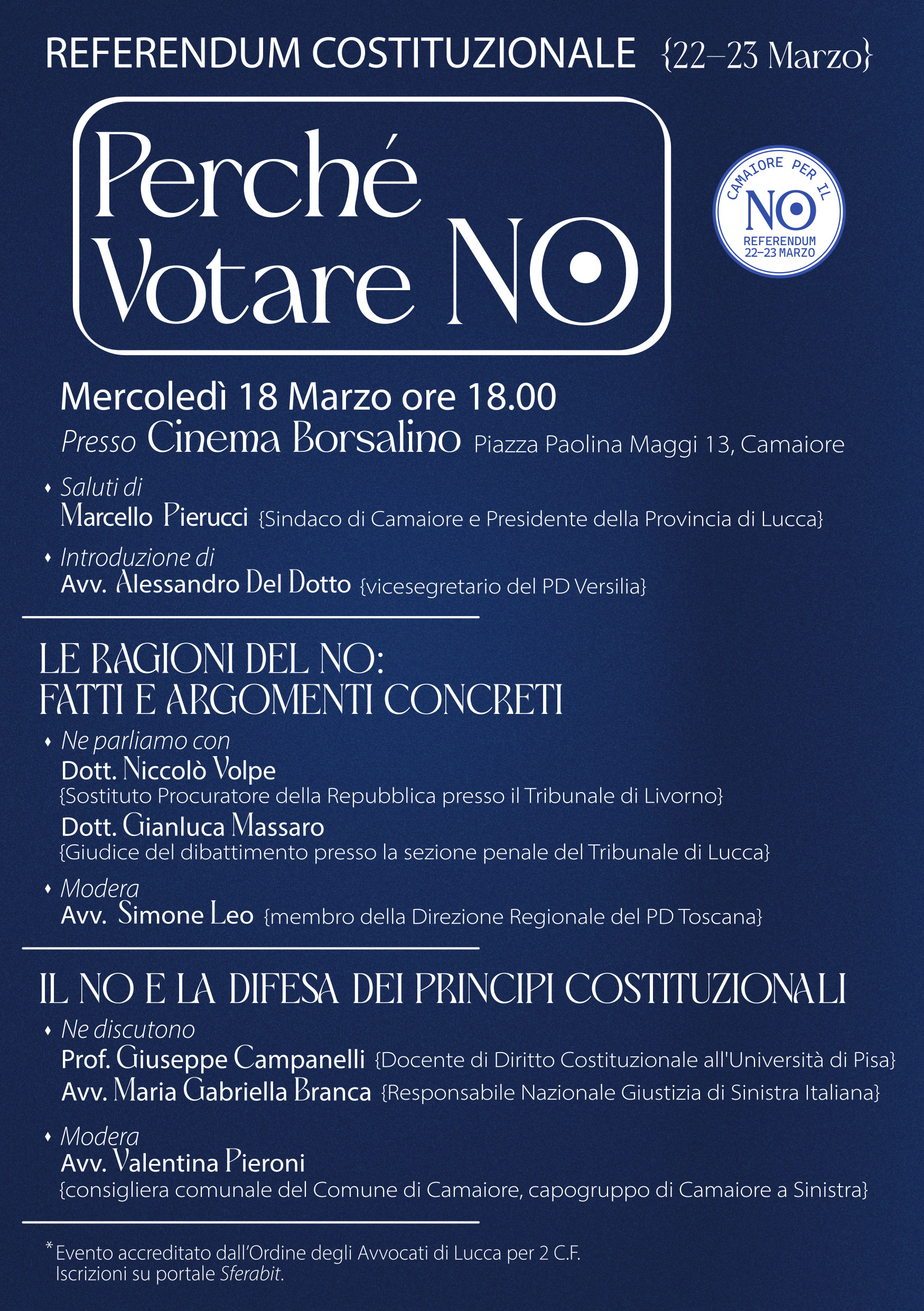 Il comitato "Camaiore per il NO al Referendum 22 - 23 Marzo" organizza un'iniziativa pubblica che si terrà mercoledì 18 marzo alle ore 18 presso il cinema Borsalino a Camaiore.