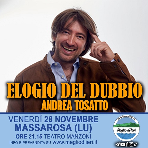 "Elogio del dubbio", il nuovo spettacolo di Andrea Tosatto, al Teatro Manzoni di Massarosa venerdi 28 novembre