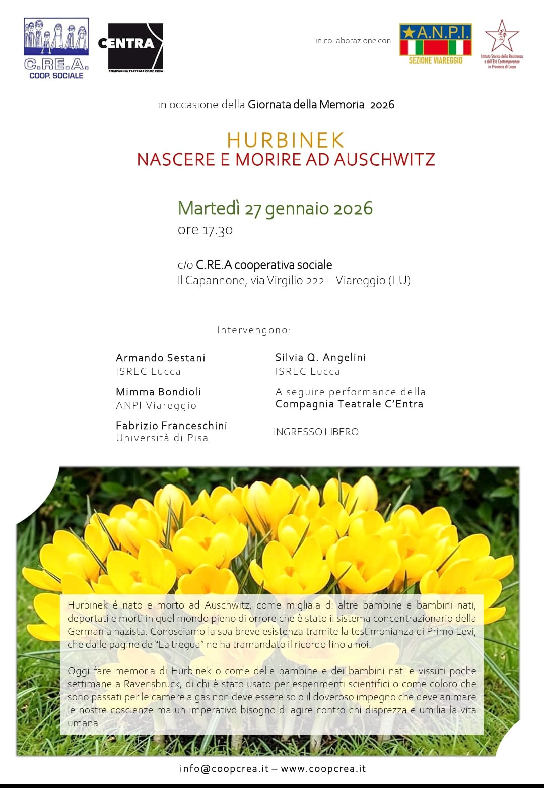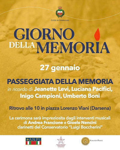 La sezione Viareggio di ANPI invita la cittadinanza a partecipare alle tre iniziative che si svolgeranno a Viareggio per martedì 27 gennaio, Giorno della Memoria: "Passeggiata della memoria" con ritrovo alle ore 10 in piazza Lorenzo Viani; "I figli della Shoah" alle ore 17,30 presso la Galleria d'Arte Moderna e Contemporanea, nel palazzo delle Muse in piazza Mazzini e "Hurbinek - Nascere e morire ad Auschwitz" alle ore 17,30 presso Il Capannone in via Virgilio 222.