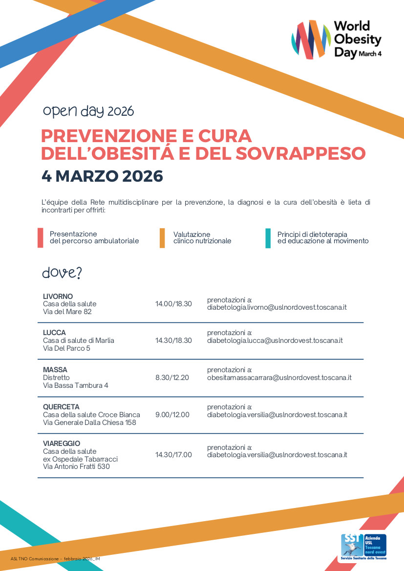 In concomitanza con la giornata mondiale dell'obesità, l'Azienda USL Toscana nord ovest promuove per la giornata di domani, 4 marzo, l'open day dedicato alla prevenzione e alla cura dell’obesità e del sovrappeso, con appuntamenti gratuiti in diverse sedi del territorio. L’iniziativa è organizzata dalla Rete multidisciplinare per la prevenzione, la diagnosi e la cura dell’obesità. I professionisti dell'Asl saranno a disposizione dei cittadini per orientamenti clinici, consigli pratici, valutazioni clinico‑nutrizionali, per fornire principi di dietoterapia ed educazione al movimento e per presentare il percorso ambulatoriale dedicato alle persone con sovrappeso e obesità.