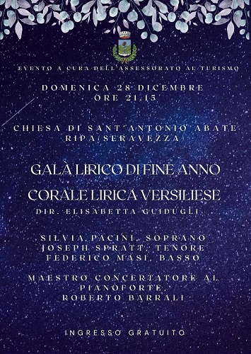 Si terrà domenica 28 dicembre, alle ore 21,15 nella chiesa di Sant'Antonio Abate a Ripa, il Galà lirico di fine anno della Corale lirica versiliese diretta da Elisabetta Guidugli. Si tratta del nuovo concerto promosso dall'Assessorato al turismo e che segue il successo ottenuto dalla serata di lirica a Seravezza, di gospel a Ripa e del recital di pianoforte a Querceta. Si esibiranno il soprano Silvia Pacini, il tenore Joseph Spratt e il basso Federico Masi. Maestro concertatore al pianoforte, Roberto Barrali.