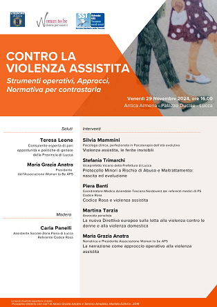 «Contro la violenza assistita - Strumenti operativi, approcci e normativa per contrastarla»: è questo il tema dell'incontro in programma a Palazzo Ducale (Antica Armeria), venerdì 29 a partire dalle 16, organizzato dalla Provincia di Lucca, in collaborazione con l'associazione 'Woman to be Aps' e l'Azienda Usl Toscana Nord-Ovest.