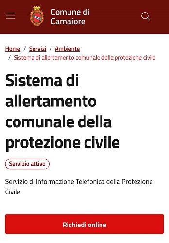 È ufficialmente attivo il nuovo sistema di allertamento comunale della Protezione Civile. Il servizio, fruibile gratuitamente, è attivabile tramite il sito istituzionale del Comune di Camaiore - sezione "Servizi" -, e consente ad ogni cittadino iscritto di ricevere avvisi e informazioni tempestive in caso di criticità o emergenze sul territorio.