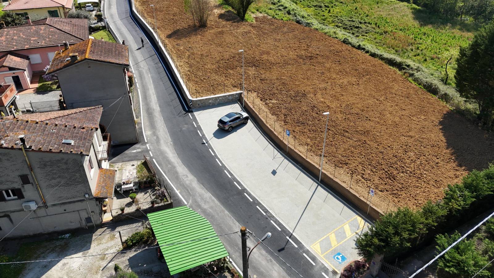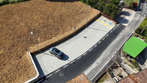 Il parcheggio, invece, sorge all'inizio del tratto oggetto di allargamento e permetterà di 11 posti auto, di cui 1 per portatori di disabilità. La pavimentazione, in virtù della politica ambientale con cui il Comune di Camaiore da tempo ha deciso di agire nella creazione di nuove aree a parcheggio, è stata realizzata completamente in invariante idraulica, una modalità realizzativa che non intacca il livello di permeabilità del terreno e quindi consente il drenaggio dell'acqua senza creare problematiche idrogeologiche. Il tutto è stato corredato da pali di pubblica illuminazione.
