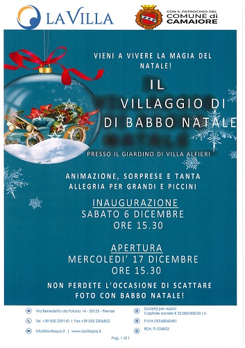 Inaugurazione ufficiale - sabato 6 dicembre ore 15. L’appuntamento con la cerimonia di apertura del Villaggio di Babbo Natale è fissato per sabato 6 dicembre alle ore 15, presso RSA & Villa Alfieri, in Via Alfieri 14 a Lido di Camaiore. Un pomeriggio di festa e convivialità aperto a tutti, con: