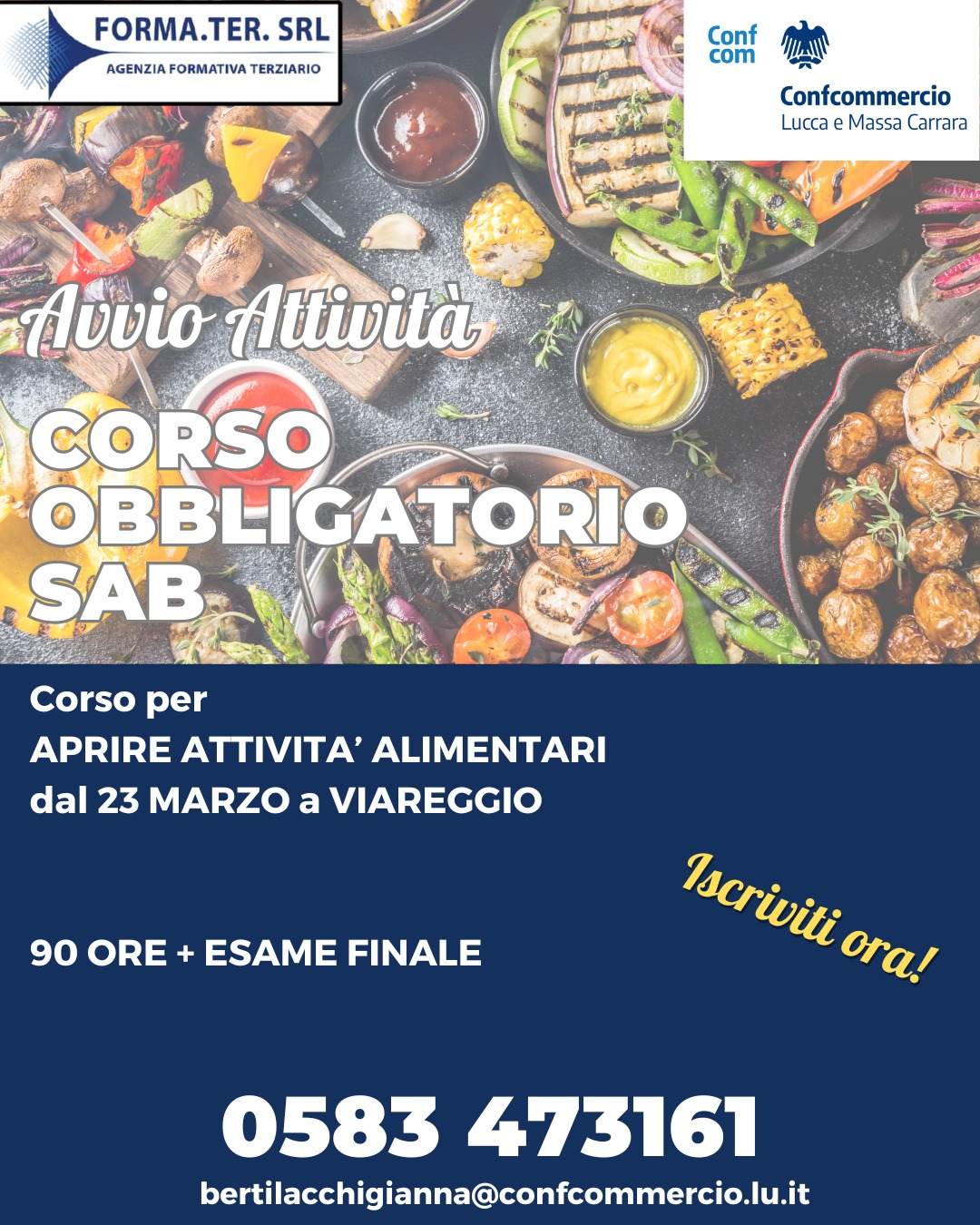 Forma.Ter, agenzia formativa di Confcommercio Province di Lucca e Massa Carrara informa che sono disponibili gli ultimissimi posti per partecipare al corso Sab (ex Rec) in programma a partire da lunedì 23 marzo nella sede Confcommercio di Viareggio (via Repaci). Le lezioni avranno una durata complessiva di 90 ore e si svolgeranno in presenza. Al termine è previsto lo svolgimento dell'esame conclusivo di questo corso, estremamente importante in quanto necessario per abilitarsi all'apertura di attività commerciali collegate alla vendita e somministrazione di alimenti e bevande. Una occasione preziosa dunque per i partecipanti, che in questo modo possono aprirsi nuovi possibili sbocchi professionali.