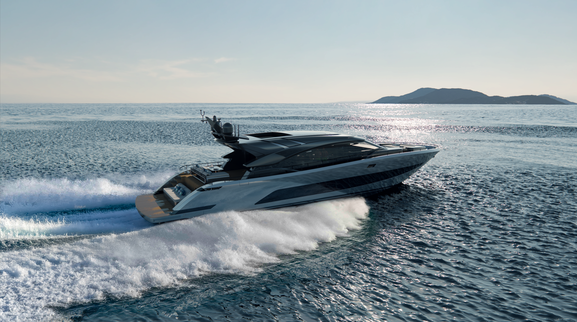 Lower Deck. Il Lower Deck ospita la zona notte, organizzata per offrire massimo comfort e privacy. Gli spazi possono accogliere fino a 8 ospiti, a seconda della configurazione scelta dall’armatore, con una suite armatoriale a tutto baglio e cabine ospiti curate nei dettagli. L’attenzione ai materiali, alle finiture e all’illuminazione contribuisce a creare un’atmosfera raffinata e contemporanea, in cui il design italiano dialoga con soluzioni funzionali pensate per la vita a bordo ad alta velocità. Separata, l’area equipaggio garantisce operatività efficiente e discrezione durante la navigazione.