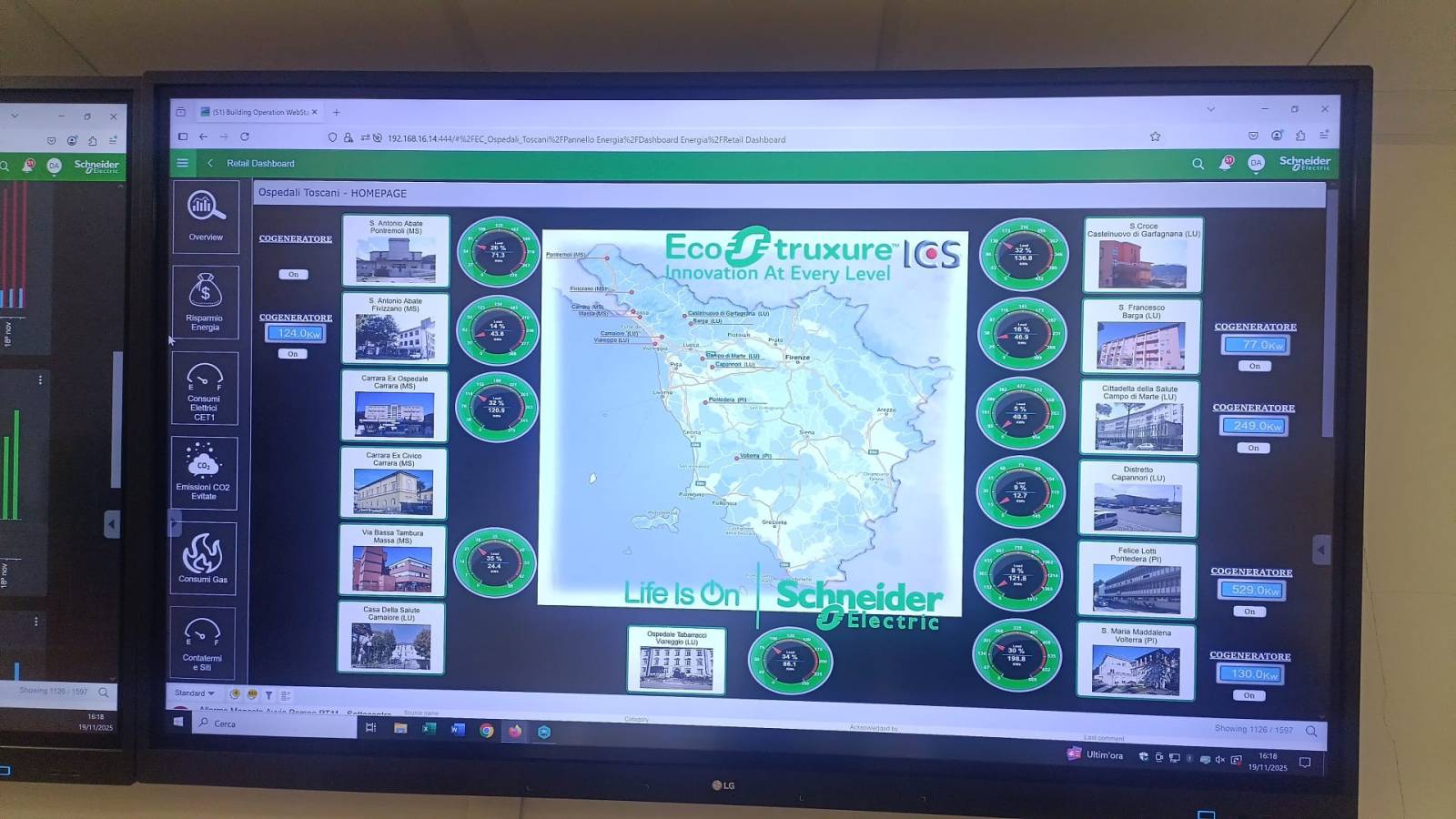 Sono stati ottimi i risultati ottenuti con il primo contratto di efficientamento energetico su 13 strutture ospedaliere e territoriali dell’Azienda USL Toscana nord ovest, con un risparmio medio complessivo del 41% sui consumi. E’ stato evidenziato dal direttore del dipartimento tecnico e patrimonio dell’Asl Nicola Ceragioli e dall’energy manager di “Note srl” Silvia D’Agostino nel corso del recente Forum Risk Management ad Arezzo, in un incontro nazionale al quale l’Azienda sanitaria è stata chiamata a relazionare su questo innovativo progetto. Il primo contratto di efficientamento, attivo da 5 anni con la società “Note Srl ”, ha dunque permesso di raggiungere importanti risultati con un risparmio medio complessivo del 41% sui consumi storici 2016 – 2018 in 13 sedi aziendali: ospedale di Pontedera, ospedale di Volterra, ospedale di Barga, ospedale di Castelnuovo di Garfagnana, ospedale di Fivizzano, ospedale di Pontremoli, distretto di Camaiore, ex ospedale “Tabarracci” di Viareggio, ex ospedale “Campo di Marte” di Lucca, distretto di Capannori, ex civico e monoblocco di Carrara, distretto di Bassa Tambura a Massa. E’ stato calcolato che in due anni e mezzo sono state risparmiate 7.650 TEP - tonnellate equivalenti petrolio -, tra energia termica ed elettrica, ciò equivale ad aver tenuto chiusi e spenti questi edifici per un anno intero. In termini di nuovi alberi piantati è come se, ad esempio, a Lucca si fossero impiantati 660 ettari di bosco urbano. In questi 13 presidi è stato installato un sistema di supervisione - Building management system – BMS - che gestisce e monitora le apparecchiature meccaniche ed elettriche degli edifici e convoglia i dati nella moderna control room realizzata all’interno ospedale Versilia.