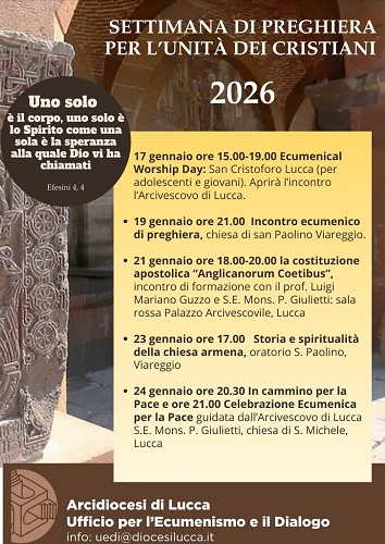 Il programma della Settimana di preghiera per l’unità dei cristiani prevede: Lunedì 19 gennaio ore 21, nella chiesa di San Paolino a Viareggio un incontro ecumenico di preghiera. Mercoledì 21 gennaio ore 17, incontro sulla costituzione «Anglicanorum Coetibus», con l’arcivescovo Paolo Giulietti e Luigi Mariano Guzzo (Università di Pisa). Venerdì 23 gennaio ore 17, storia e spiritualità della Chiesa armena, all’oratorio di San Paolino a Viareggio. Sabato 24 gennaio a Lucca ore 20.30 in cammino per la pace, ore 21 in San Michele in Foro celebrazione ecumenica per la pace.