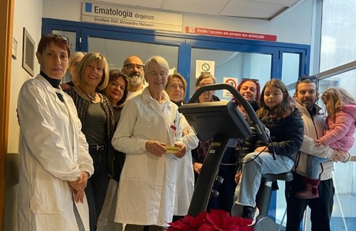 27 dicembre 2025 - Si è svolta nei giorni scorsi la consegna ufficiale al reparto di Ematologia dell'ospedale "Versilia" di una cyclette, un importante dono che, tramite il Comitto Versilia per l'ematologia ODV, la famiglia Galli ha voluto dedicare ai pazienti in isolamento per ricordare il loro caro Gilberto a due anni dalla scomparsa.L'attrezzo scelto è particolarmente utile perché le persone che si trovano "isolate" passano periodi anche lunghi senza poter avere contatti esterni. Per settimane vedono solo i muri della loro camera, il corridoio, il personale medico e infermieristico e un parente per poco tempo al giorno. La cyclette consente ai pazienti di compiere attività fisica, che può essere adattata per durata, intensità e difficoltà alle esigenze di ciascuno. Inoltre il collegamento Wifi del monitor collegato alla Bike permette di aprire lo sguardo sul mondo esterno perché ognuno può simulare sul video il luogo in cui pedalare. Infatti è possibile collegarsi a una sezione composta da circuiti virtuali altamente immersivi che possono muoversi in tempo reale secondo il ritmo della pedalata. Il responsabile del reparto Alessandro Stefanelli ha accolto i familiari di Gilberto Galli, visibilmente commossi, e ha portato loro il saluto e il ringraziamento suo, di tutto il servizio e della direzione sanitaria dell'ospedale. Il Comitato Versilia per l'Ematologia ODV ringrazia la famiglia Galli per la generosità e la società Omnis TLC di Francesco Simonini che si è fatta carico di tutti gli aspetti tecnologici, legati anche al necessario collegamento internet.