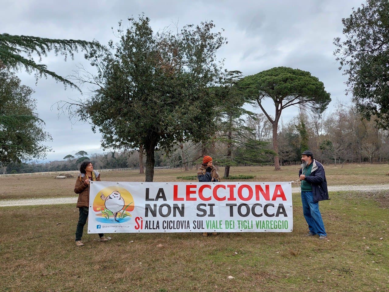 Circa un centinaio le persone presenti questo pomeriggio davanti alla sede del parco le Cascine vecchie a San Rossore per portare l’attenzione del presidente Lorenzo Bani sulla spinosa questione della ciclovia tirrenica. Una mobilitazione che ha visto coinvolto non solo il coordinamento la Lecciona non si tocca, ma molti gruppi ambientalisti, politici e singoli cittadini, non solo di Viareggio, ma anche di Pisa. Lo striscione simbolo, di 200 metri quadrati, con la scritta la lecciona non si tocca, è stato srotolato sul prato del parco, non in segno di protesta, ma di partecipazione.