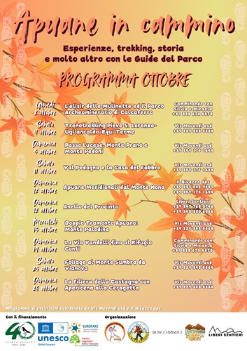 Foliage, tramonti e tante camminate: il programma di escursioni per il mese di ottobre, finanziato dal Parco delle Alpi Apuane - Unesco Global Geopark e organizzato da Bivacco Toscana APS e Vis Movendi ASD, con la collaborazione di Camminando con Silvia e Micaela, Liberi Sentieri – Free Treks e BoscoAperto, presenta offerte per tutti i gusti.