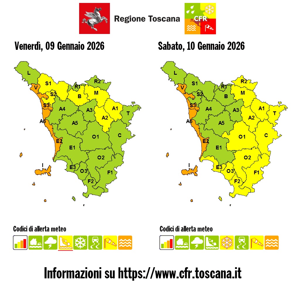 E' stata prorogata fino alle 9 di sabato 10 gennaio, dalla Regione Toscana l'allerta di livello arancio emesso ieri per rischio mareggiate sulle zone costiere della provincia V (Versilia) e S3 (Serchio Costa) e Arcipelago toscano.