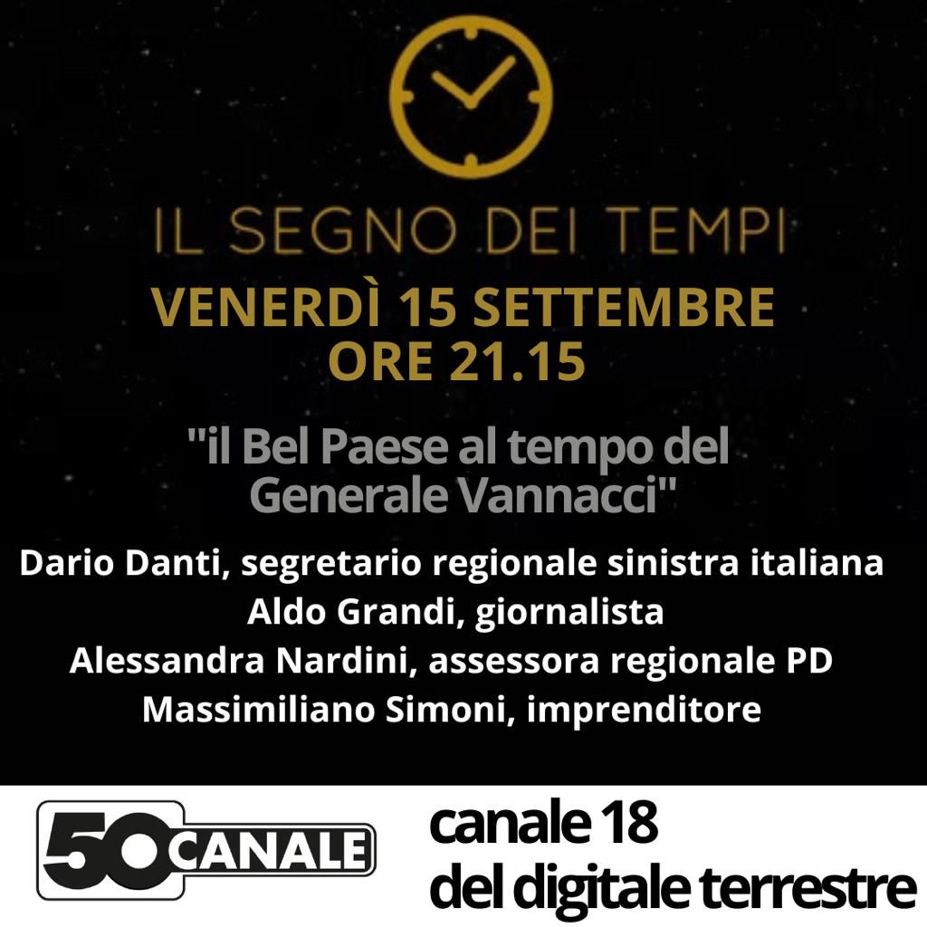 Questa sera alle 21.15 con replica domani mattina alle 11.25 su Canale 50 canale 18 del digitale terrestre, andrà in onda la trasmissione condotta da Francesco Ippolito Il segno dei tempi. Titolo della serata: Il Bel Paese al tempo del Generale Vannacci". Ospiti in studio Dario danti, segretario regionale di Sinistra Italiana, Aldo Grandi, storico e direttore (ir)responsabile delle Gazzette, Alessandra Nardini assessore regionale del Pd a Istruzione, Formazione Professionale, Università e Ricerca, Impiego, Relazioni Internazionali e Politiche di Genere, Massimiliano Simoni, imprenditore ed ex candidato a sindaco per Fratelli d'Italia a Pietrasanta. Una trasmissione che si annuncia particolarmente 'calda' visto anche il tema della puntata.