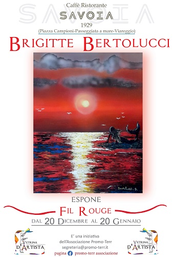 Dal 20 Dicembre al 20 Gennaio al Caffè Ristorante Savoia - inizio passeggiata a mare Viareggio - espone Brigitte Bertolucci con “Fil Rouge” una esposizione che propone dipinti a volte fantastici con sirene e conchiglie altre con rappresentazioni reali, ma tutte con un filo conduttore il colore rosso.