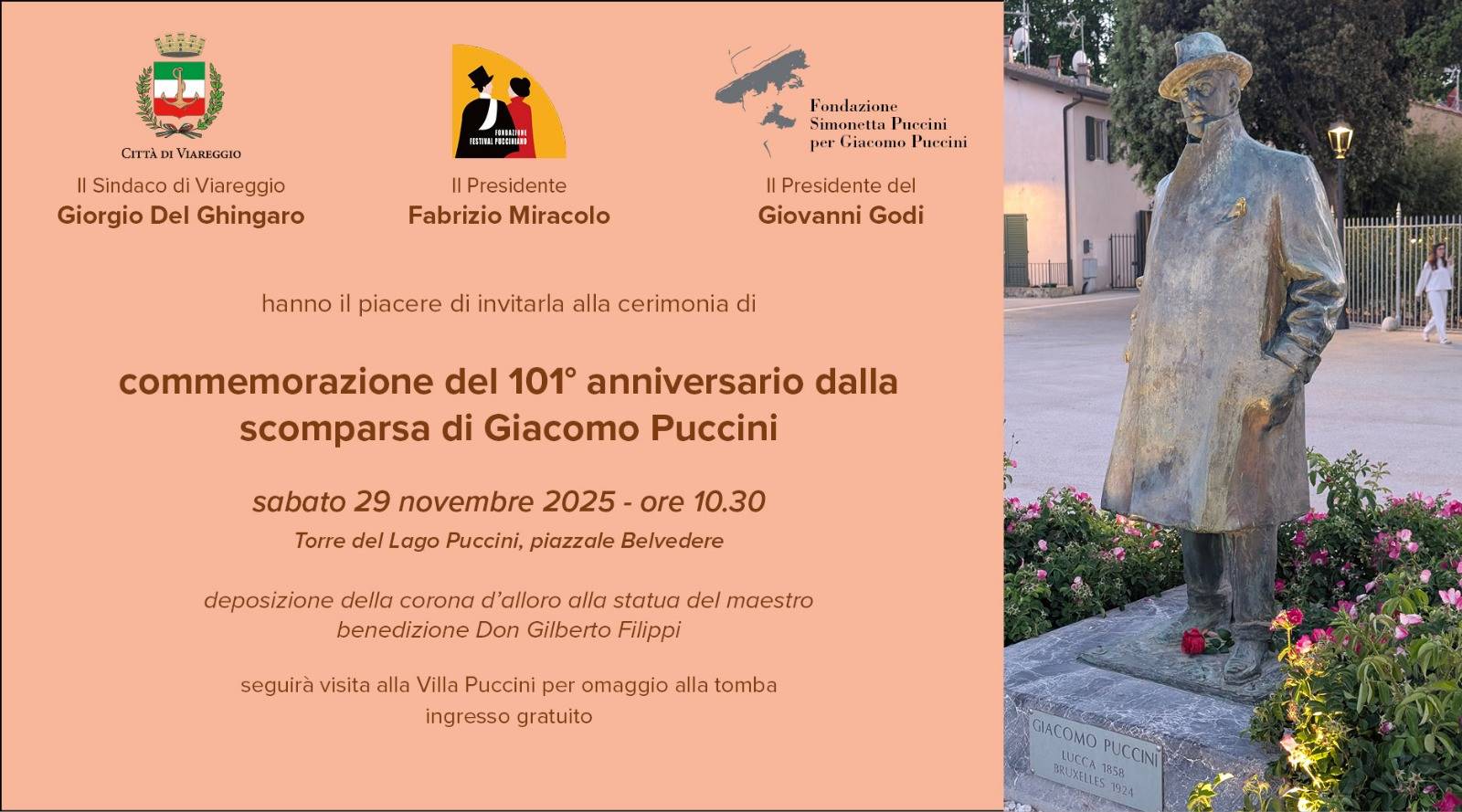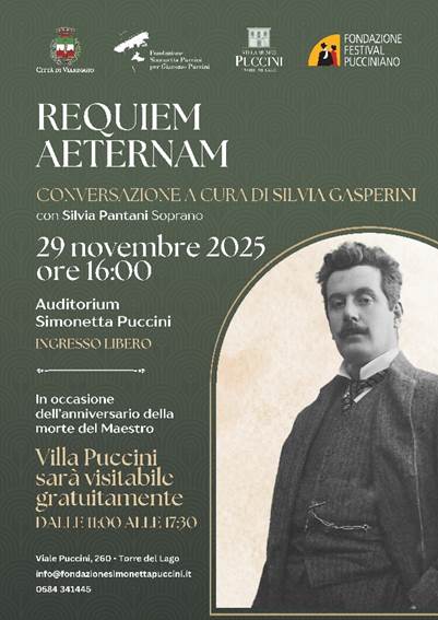 Sabato 29 novembre 2025, Torre del Lago dedica una giornata alla celebrazione del 101° anniversario della morte di Giacomo Puccini. Alle 10,30, sul Belvedere, è prevista la cerimonia di deposizione della corona di alloro ai piedi della statua a cura dell’Amministrazione Comunale, della Fondazione Festival Pucciniano e della Fondazione Simonetta Puccini e alla presenza delle autorità civili e militari. Seguirà l’omaggio alla tomba in Villa Puccini.