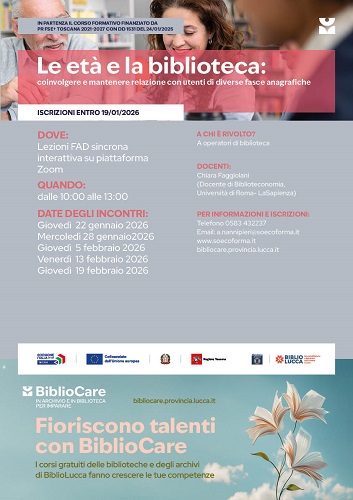 Sempre all'interno del progetto Bibliocare, partirà nel mese di gennaio anche il corso «Le età e la biblioteca: coinvolgere e mantenere relazioni con utenti di diverse fasce anagrafiche», dedicato alle strategie per rendere le biblioteche luoghi accoglienti e inclusivi per persone di età diverse. Il corso è rivolto agli operatori di biblioteche e archivi, ma anche a volontari e a tutti coloro che contribuiscono a renderle spazi sempre più attrattivi e partecipati.