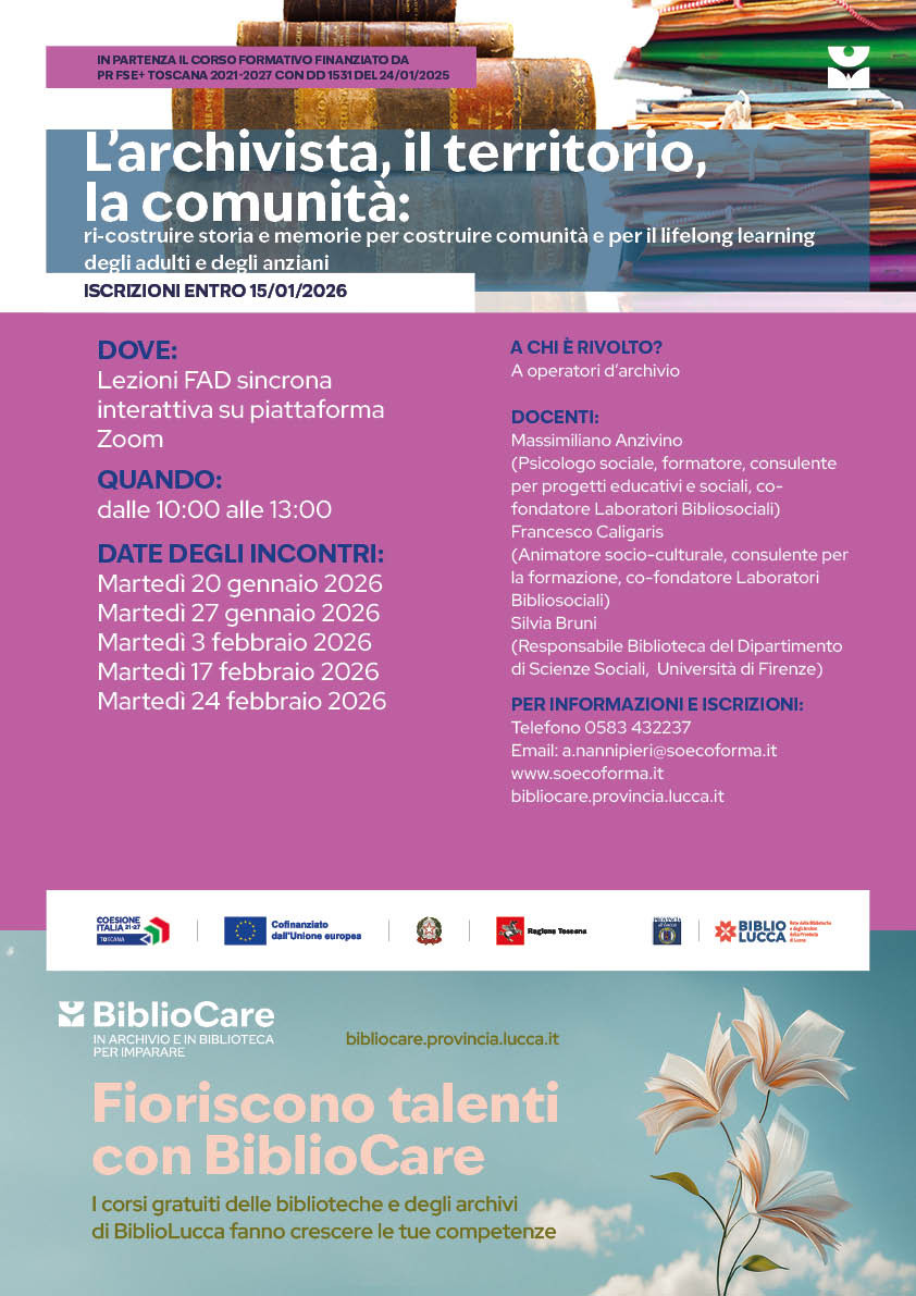 Ultimi giorni per iscriversi ai percorsi formativi gratuiti promossi dalla Provincia di Lucca nell'ambito del progetto Bibliocare, che prosegue con due corsi specialistici dedicati ad archivisti, bibliotecari e operatori culturali, pensati per rafforzare il ruolo sociale di archivi e biblioteche e rispondere in modo innovativo ai bisogni delle comunità.