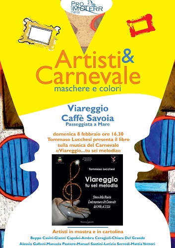 In concomitanza con la mostra “Artisti & Carnevale” in essere fino al 28 febbraio al Caffè Savoia - passeggiata a mare di Viareggio - l’Ass. Promo-Terr in collaborazione con i gestori del locale, organizzano una serie d’iniziative legate al Carnevale di Viareggio la prima delle quali sarà domenica 8 febbraio alle 16.30 con la presentazione del libro di Tommaso Lucchesi “Viareggio…tu sei melodia” un volume che racchiude gli ultimi trent’anni della storia della musica contemporanea del Carnevale. Tommaso Lucchesi presenterà il suo libro insieme ad alcuni cantanti che hanno fatto la storia della musica carnevalesca: Samanta Giorgetti e Loredana Brega ed alcuni ospiti a sorpresa. Sono centocinque le biografie di musicisti parolieri e cantanti che hanno segnato gli ultimi trent’anni della storia musicale del Carnevale, un viaggio unico alla scoperta delle storie e dei segreti dietro alcune delle canzoni più amate di sempre.