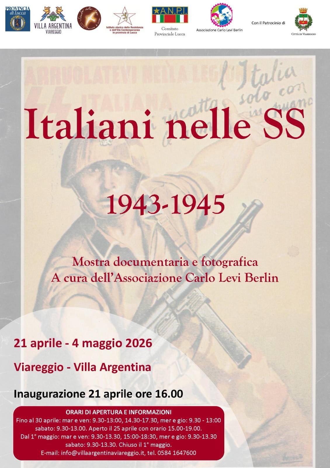 Villa Argentina, sempre nell'ambito del calendario delle celebrazioni legate alla Liberazione, ospita una seconda mostra che verrà inaugurata il 21 aprile alle 16, 'Italiani nelle SS 1943-1945' realizzata dalla Provincia di Lucca e dalla Scuola per la Pace, in collaborazione con l'Istituto storico della Resistenza e l'Anpi provinciale e con il patrocinio del Comune di Viareggio. Si tratta di un'esposizione è bilingue che nasce dal lavoro di ricerca di Gianfranco Ceccanei, classe 1942, a lungo docente di storia e cultura italiana all'Università popolare di Berlino, nonché anima dell'associazione 'Carlo Levi Berlin' che raccoglie gli emigrati italiani nella capitale tedesca.