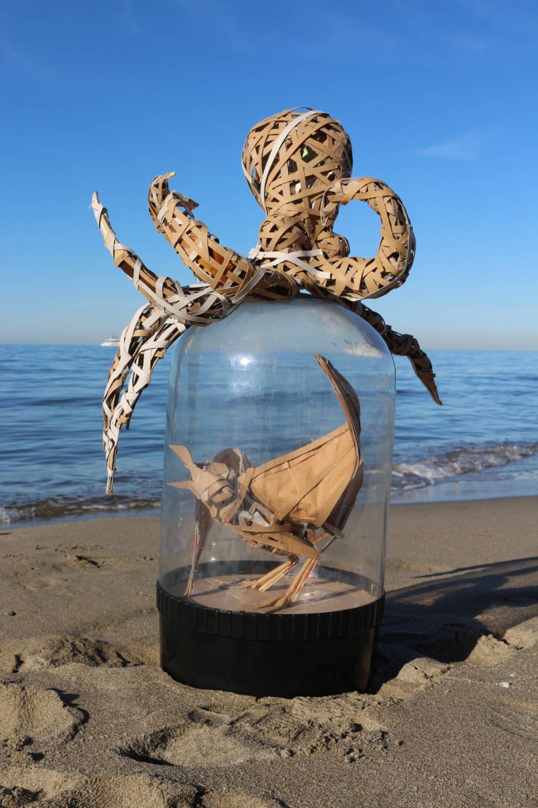 Ammassi di residui ferrosi vengono così trasformati in un enorme pescespada; così come imballaggi di cartone vengono trasformati da Emiliano Lazzari in maestosi gabbiani. Questi ultimi rappresentano non solo un simbolo di libertà e di sconfinati orizzonti marini, ma anche e soprattutto l’altro aspetto specifico di questa esposizione, legato al riciclo di materiale da discarica, nuovo habitat dei moderni gabbiani. Lazzari è uno studente del Liceo Barsanti e Matteucci di Viareggio, un ragazzo geniale e atipico che non ha bisogno di connessioni tecnologiche per relazionarsi col mondo: rifiutando di possedere uno smartphone, è libero di attingere e accedere in modo esclusivo agli spazi sconfinati della sua fantasia.