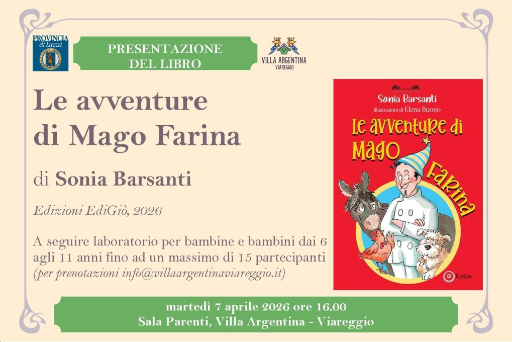 Martedì 7 aprile, Villa Argentina, a partire dalle 16 si trasformerà nel regno del Mago Pasticcere, grazie alla presentazione del libro 'Le avventure del Mago Farina' di Sonia Barsanti (ed. EdiGiò), dando vita a un appuntamento un po' speciale di 'Scrittori e Lettori a Villa Argentina': a parlare di questo volume sarà l'autrice che porterà coloro che saranno all'incontro - grandi e piccini - in un mondo fatato.