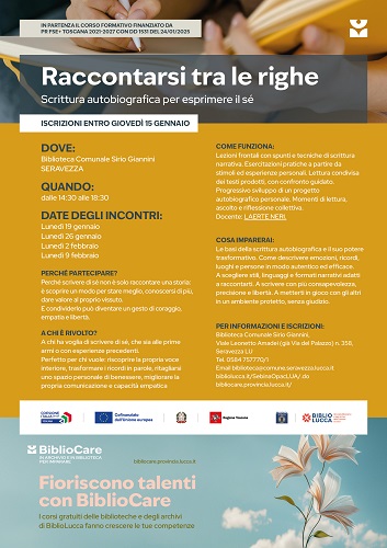 Ci sono ancora pochi giorni per iscriversi al corso «Raccontarsi tra le righe - Scrittura autobiografica per esprimere il sé» che prenderà il via il 19 gennaio alla Biblioteca 'Sirio Giannini' di Seravezza, per il progetto della Provincia di Lucca, Bibliocare. Le iscrizioni, infatti, chiuderanno il prossimo 15 gennaio.