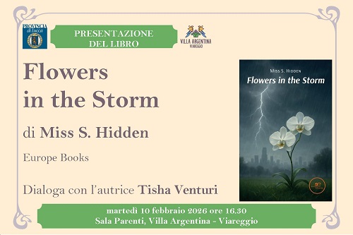 «Flowers in the Storm» è il titolo del libro protagonista della presentazione, assieme alla sua autrice, Miss S. Hidden, in programma a Villa Argentina martedì 10 febbraio a partire dalle 16:30, quando si potrà scoprire questo volume, grazie alla chiacchierata dall'autrice con Tisha Venturi, nell'ambito della rassegna 'Scrittori e lettori a Villa Argentina'.