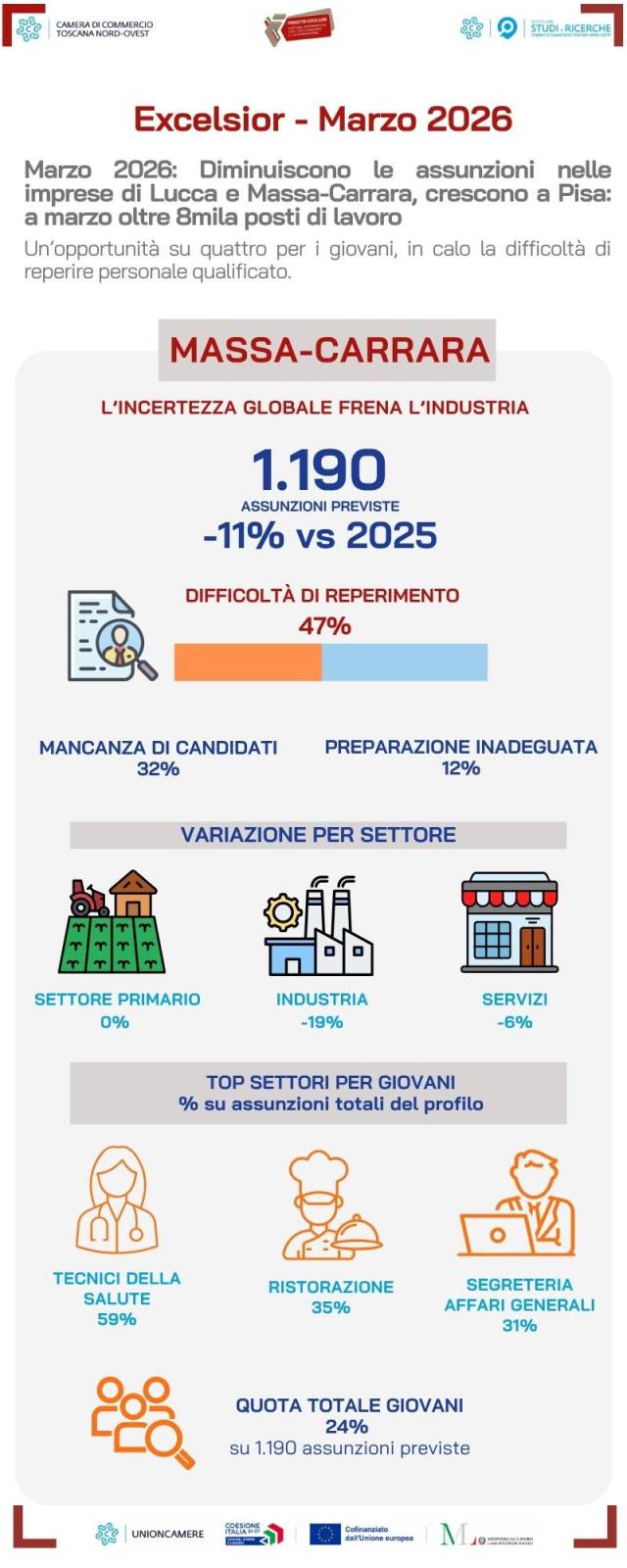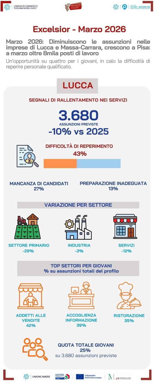 Viareggio, 20 marzo 2026. Le imprese delle province di Lucca, Massa-Carrara e Pisa prevedono di assumere complessivamente 8.060 lavoratori nel mese di marzo 2026, un dato in lieve calo rispetto allo stesso mese dell'anno precedente. La diminuzione riguarda in particolare Lucca (-10%) e Massa-Carrara (-11%), mentre Pisa va in controtendenza registrando una crescita (+2%). Circa un quarto delle nuove opportunità di lavoro è esplicitamente indirizzato agli under 30, in lieve flessione rispetto al 2025. Il perimetro delle opportunità per i giovani risulta tuttavia più ampio se si considera che, per un ulteriore 30% circa delle entrate programmate, le imprese indicano l'età anagrafica come variabile non discriminante ai fini dell'assunzione. Le maggiori occasioni dirette per i giovani si concentrano nei settori della ristorazione e del commercio, ma resta significativa anche la richiesta di operai specializzati. Le imprese continuano inoltre a segnalare difficoltà nel reperire personale, sebbene il fenomeno sia in parziale attenuazione rispetto all'anno precedente. In media, poco meno di una posizione su due resta di difficile copertura. Le criticità maggiori si evidenziano a Massa-Carrara (47%), seguita da Pisa (44%) e Lucca (43%).