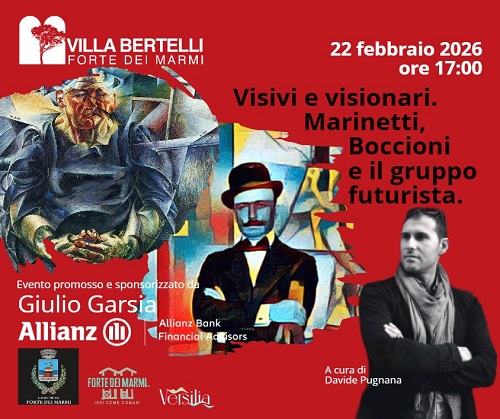 Lo storico dell'arte e scrittore Davide Pugnana, domenica 22 febbraio alle 17 torna nel giardino d'Inverno di Villa Bertelli a Forte dei Marmi con Visivi e visionari. Marinetti, Boccioni e il gruppo futurista un nuovo incontro in cui parlerà del Futurismo letterario e figurativo, mettendo al centro il percorso di Marinetti e di Boccioni, padri del Futurismo, la prima avanguardia storica italiana del XX secolo, nata ufficialmente nel 1909 per celebrare velocità, modernità, dinamismo e rifiuto del passato.