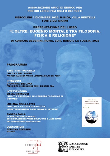 L'amicizia, che tra Eugenio Montale ed Enrico Pea ha attraversato il ventesimo secolo senza mai venire meno, sarà il tema dell'incontro promosso dall'associazione Amici di Enrico Pea e in programma mercoledì 3 dicembre alle 16 nel Giardino d'Inverno di Villa Bertelli a Forte dei Marmi, dove per volontà della presidente Giovanna Bellora verrà presentato il libro di Adriana Beverini "L'Oltre. Eugenio Montale tra filosofia, fisica e religione" - Edizioni Il Ramo e la Foglia -.