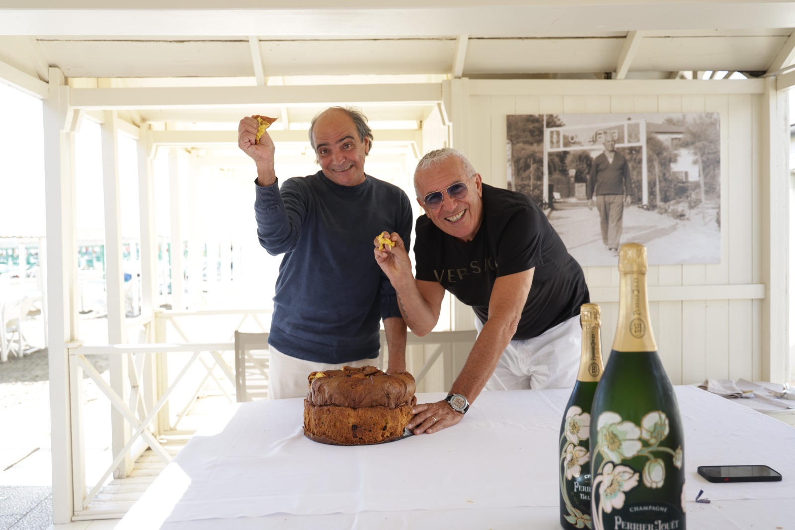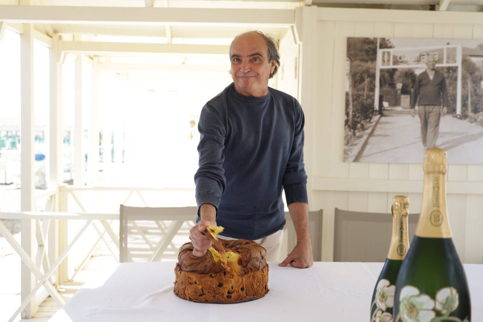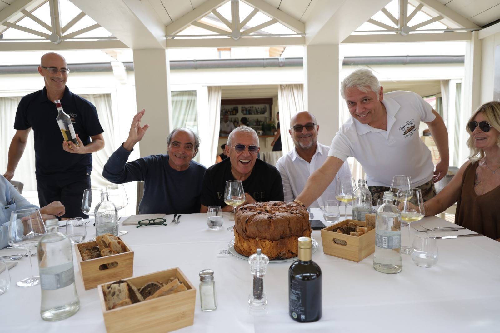 Ma c'è di più. Paolini, prima dell'assaggio finale, richiamando a sé gli astanti distratti da un pranzo straordinario quanto semplice messo in tavola dalla cucina del Bagno Silvio di Luca e Gianluca Dazzi la cui famiglia lo gestisce da 100 anni, ha chiesto perentoriamente di mettere da parte forchette e coltelli e pulirsi le mani, magari con i cubetti di ghiaccio e non con le salviette profumate: Il panettone si mangia con le mani. Anzi, per l'esattezza si strappa con le mani e, così dicendo, ha afferrato, letteralmente, un pezzo del panettone monstre seguito dagli altri commensali, inizialmente un po' titubanti, ma, poi, via via sempre più convinti.