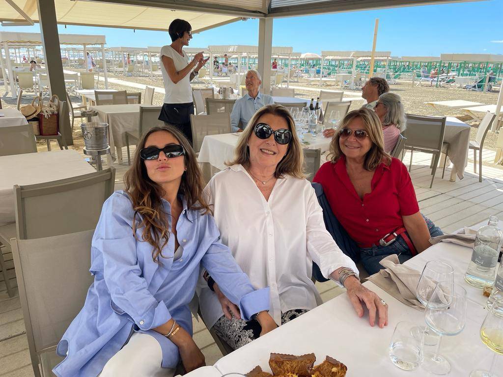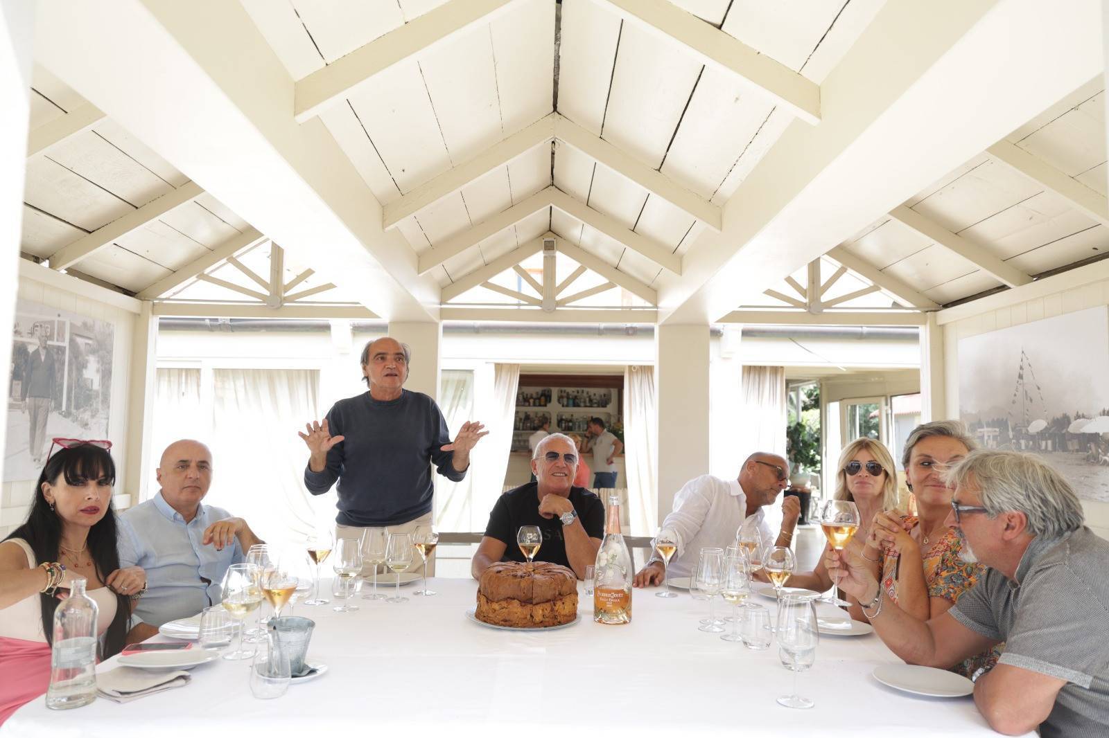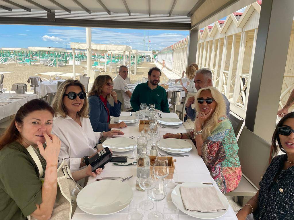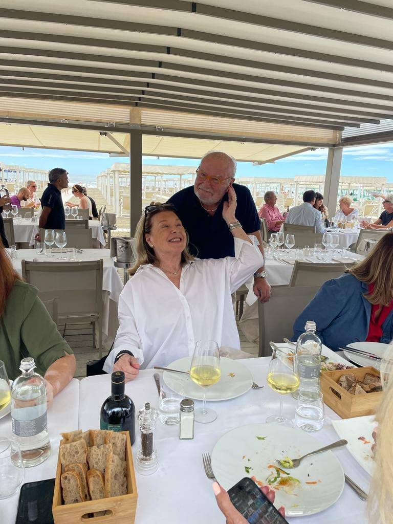 Quanto al pranzo, che dire? Mercatali non ha, giustamente, voluto sentire ragioni e come dargli torto? Già nel suo ultimo libro scritto a quattro mani con Davide Paolini, A tavola vista mare, aveva tessuto le lodi dello spaghetto alle arselle, piatto tipico versiliese, e così è stato anche oggi. Prima, però, una insalata di mare che definire insalata sarebbe riduttivo, in realtà una composizione di mare deliziosa. A fianco un olio rigorosamente d'autore firmato Marchesi Antinori. Il tutto annaffiato da un vino particolare, il Lady F Orpicchio di Donne Fittipaldi da Bolgheri e, a seguire, un vermentino 'Solo Sole' Poggio al Tesoro 2021 sempre da quel paradiso enologico che trova le sue radici nel comune di Castagneto Carducci. Presente e, come sempre, affascinante, Maria Fittipaldi Menarini che conduce l'azienda insieme alle sue quattro figlie.