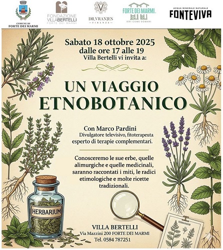 Marco Pardini, divulgatore televisivo, fitoterapeuta, esperto di terapie complementari, torna a Villa Bertelli per un Viaggio etnobotanico da dedicare al suo numeroso e affezionato pubblico. Nell'incontro, in programma sabato 18 ottobre alle 17 nel Giardino d’Inverno di Villa Bertelli a Forte dei Marmi, spiegherà le sue erbe, quelle alimurgiche e quelle medicinali e racconterà i miti, le radici, etimologiche e molte ricette tradizionali.