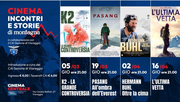 La montagna al centro di avventure, sogni e storie, di vite, peripezie e imprese straordinarie. La montagna al centro anche dello schermo e della sala cinematografica, luogo di incontro, confronto e scoperte, come può essere una vetta, e il viaggio per raggiungerla. La montagna al centro di sfide e conquiste, di racconti coraggiosi e di film che offrono uno sguardo, originale, su di essi, sui loro protagonisti e le loro storie. Film che saranno protagonisti di "Cinema Incontri e Storie di Montagna", la rassegna organizzata dal Cinema Centrale in collaborazione con il Cai di Viareggio e che porterà sullo schermo, in quattro serate, il 5 e 19 marzo, e il 2 e 16 aprile, alle 21, con un'introduzione precedente a ciascun proiezione a cura dell'associazione al prezzo unico di 8 euro e ridotto a 6 per i soci Cai, storie di uomini e donne che, spinti dall'amore e dalla passione per la montagna, hanno sfidato i propri e i limiti altrui.