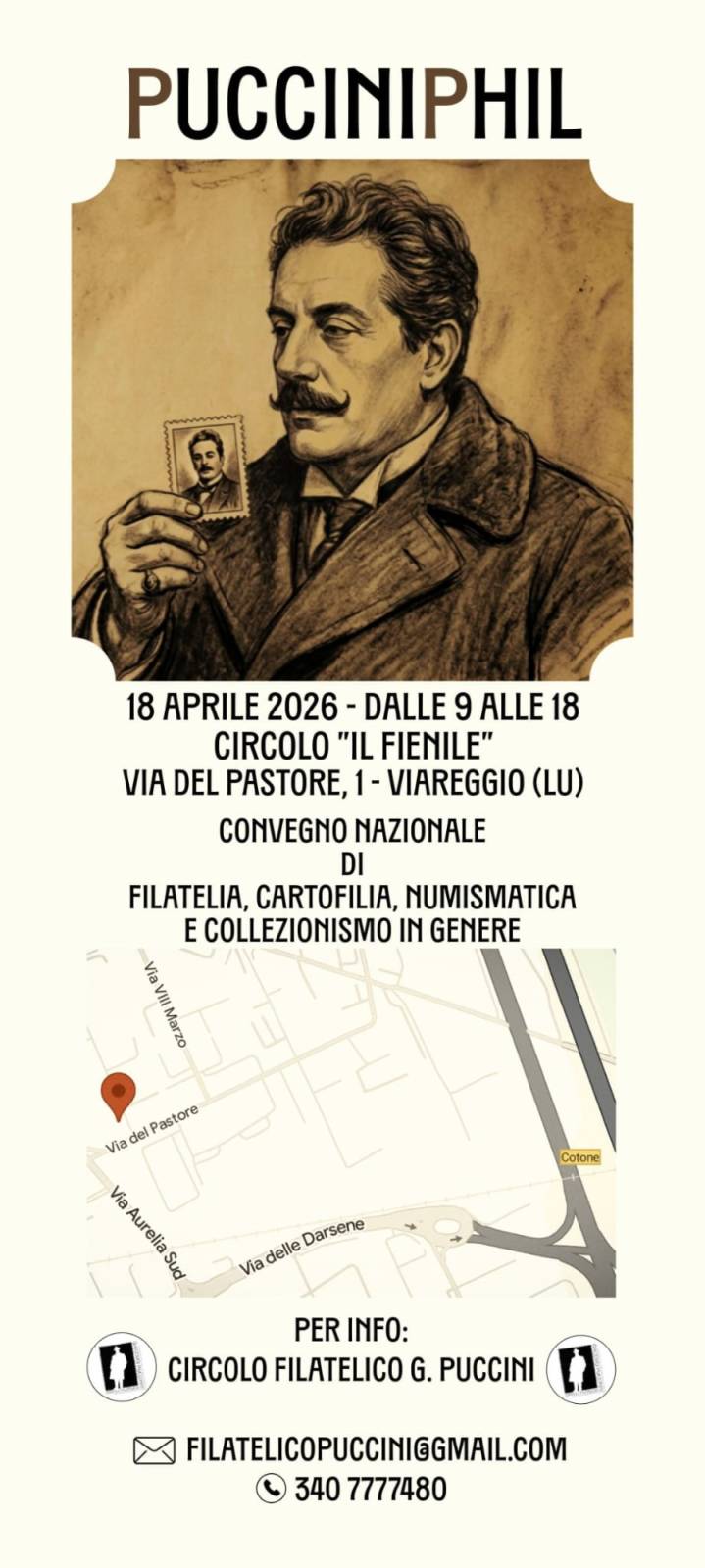 Il convegno filatelico “PucciniPhil”, che si terrà dalle 9 alle 18, nasce con l'obiettivo di riportare Viareggio al centro del panorama collezionistico nazionale, valorizzando il legame indissolubile tra il territorio e le eccellenze culturali che lo rappresentano nel mondo, a partire dalla figura di Giacomo Puccini. Riteniamo che il "PucciniPhil" rappresenti un’importante occasione di promozione territoriale, capace di attrarre appassionati e studiosi, contribuendo a dare lustro alla città in un’ottica di sinergia tra diverse espressioni culturali. L’ingresso al convegno è libero e sarà presente un ufficio distaccato di Poste Italiane con annullo speciale dedicato all’evento.