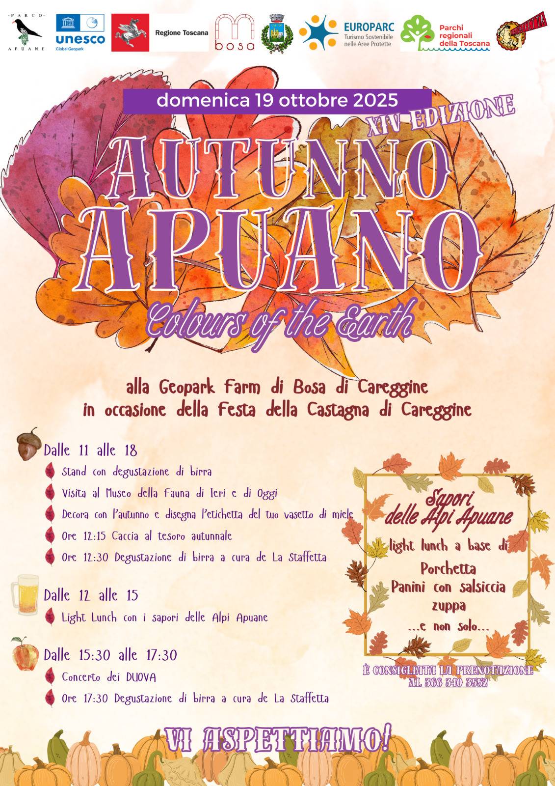Domenica 19 ottobre 2025 si rinnova l'appuntamento con la tradizione e la gastronomia locale alla Geopark Farm di Bosa di Careggine. L'evento, intitolato "Sapori delle Alpi Apuane", fa parte della XIV edizione della rassegna "Autunno Apuano Colours of the Earth", e si svolge in concomitanza con la Festa della Castagna di Careggine.