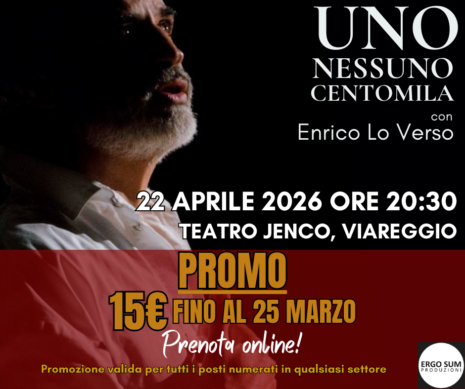 Lo spettacolo “Uno Nessuno Centomila” basato sul celebre omonimo libro di Luigi Pirandello e interpretato dall’attore Enrico Lo Verso, con regia di Alessandra Pizzi, andrà in scena a Viareggio presso il Teatro Jenco, Mercoledì 22 Aprile 2026, alle ore 20,30.