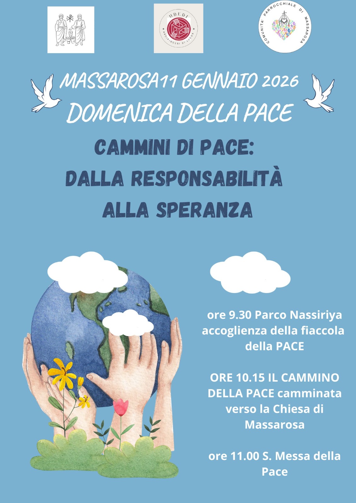 In occasione del mese di gennaio, che la Chiesa dedica alla pace, domenica 11 gennaio si terrà a Massarosa l'evento «Cammini di pace: dalla responsabilità alla speranza». Il ritrovo è fissato per le ore 9,30 presso il parco Caduti di Nassirya; da qui partirà la «Camminata della pace» verso la chiesa parrocchiale dove, alle 11, sarà celebrata la messa. Durante la funzione si pregherà affinché la violenza e i soprusi smettano di essere considerati mezzi per risolvere i conflitti che sconvolgono il mondo. L'appuntamento è organizzato dagli Uffici diocesani per la Pastorale sociale e del lavoro e per l'Ecumenismo e il dialogo interreligioso, in collaborazione con la comunità parrocchiale locale. Le celebrazioni e i momenti di approfondimento dedicate alla pace proseguiranno poi domenica 18 gennaio presso la parrocchia San Giovanni Bosco a Viareggio e si concluderanno nel centro storico di Lucca il 24 gennaio.