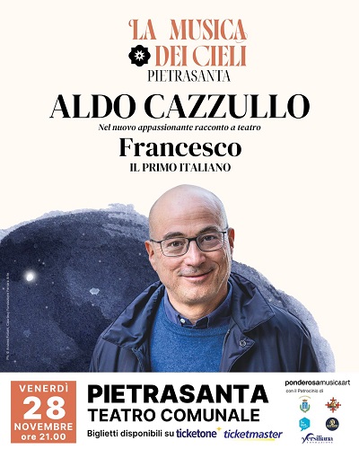 Comincia così il racconto di Aldo Cazzullo, nel monologo teatrale dal titolo “Francesco. Il primo italiano”, ispirato al suo ultimo omonimo libro edito da Harper Collins, che andrà in scena venerdì 28 novembre alle 21 al Teatro Comunale di Pietrasanta, anteprima di Musica dei Cieli, Festival organizzato da Compagnia della Musica con il patrocinio e il sostegno del Comune di Pietrasanta.