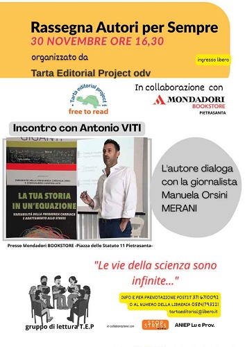 Domenica 30 novembre alle ore 16,30 alla Mondadori Bookstore di Pietrasanta si articolerà un nuovo incontro letterario della rassegna letteraria “Autori per sempre” organizzata e ideata da Tarta Editorial Project odv in collaborazione con la libreria e Aniep Lu e provincia.