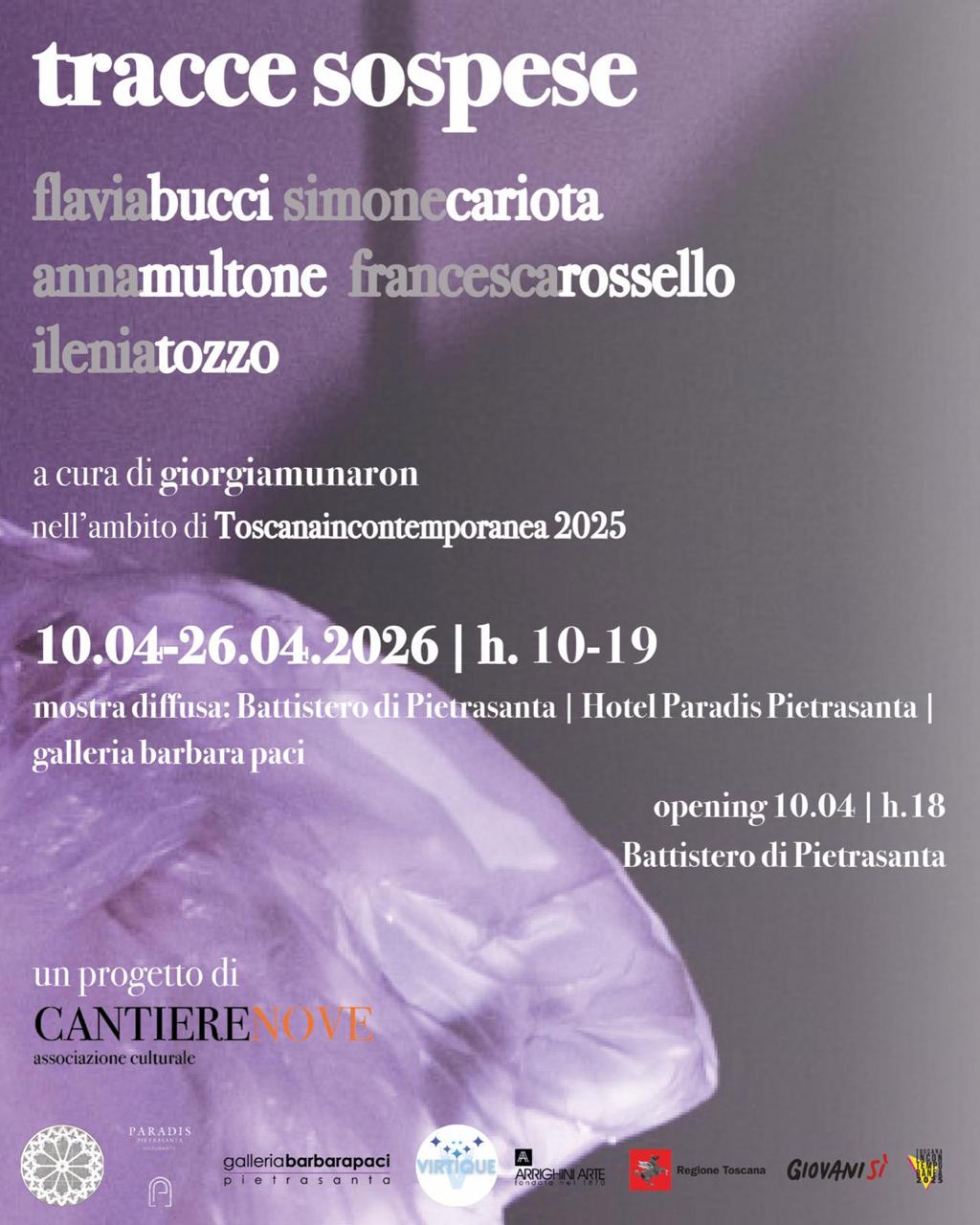 Il 10 aprile apre alle ore 18 al battistero di Pietrasanta la mostra diffusa " tracce sospese" a cura di Giorgia Munaron, che vedrà coinvolti cinque artisti under 35 attivi in Toscana con le loro opere presso il battistero, l'hotel Paradis Pietrasanta e la galleria d'arte Barbara Paci. Il progetto è stato realizzato dall'associazione CantiereNove.