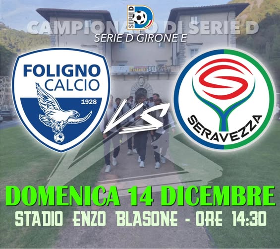Domenica 14 dicembre il Seravezza Calcio affronterà allo stadio Enzo Blasone di Foligno la Ads Fulgens Foligno allo stadio per la 16^ giornata di andata del campionato di calcio di serie D girone E- Il Seravezzza attualmente è secondo in classifica con 33 punti e un ruolino di 10 vittorie, 2 sconfitte, 3 pareggi e una serie ininterrotta di vittorie in casa. Il Foligno è, invece al quarto posto in classifica. Mister Cristiano Masitto ha dichiarato: “Un’altra partita importante che ci deve far crescere. L’obiettivo primario è ancora quello di salvarci, poi vedremo, anche se è giusto alzare via via l’asticella per il giro di boa di metà campionato. Andiamo a Foligno per muovere ancora la classifica, cercando di migliorare in altri aspetti del gioco. Non abbiamo Vanzulli, per il resto dovremmo essere tutti e cercherò di fare le scelte migliori per la squadra”. La prossima partita sarà in casa con il San Donato Tavernelle domenica 21 dicembre.